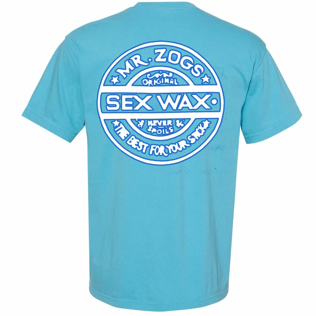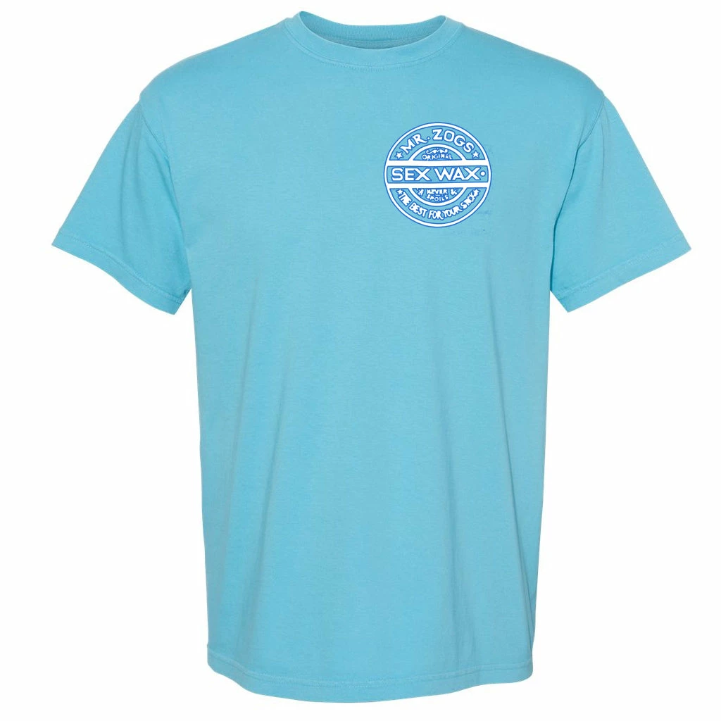 Premium 6.1 ounce garment dyed tee. Pre-shrunk,soft washed fabric with set-in sleeves, 3/4″ ribbed collar and double-needle top stitched neckline. Features large Sexwax Pinstripe print on back with smaller version of same located on left front chest.