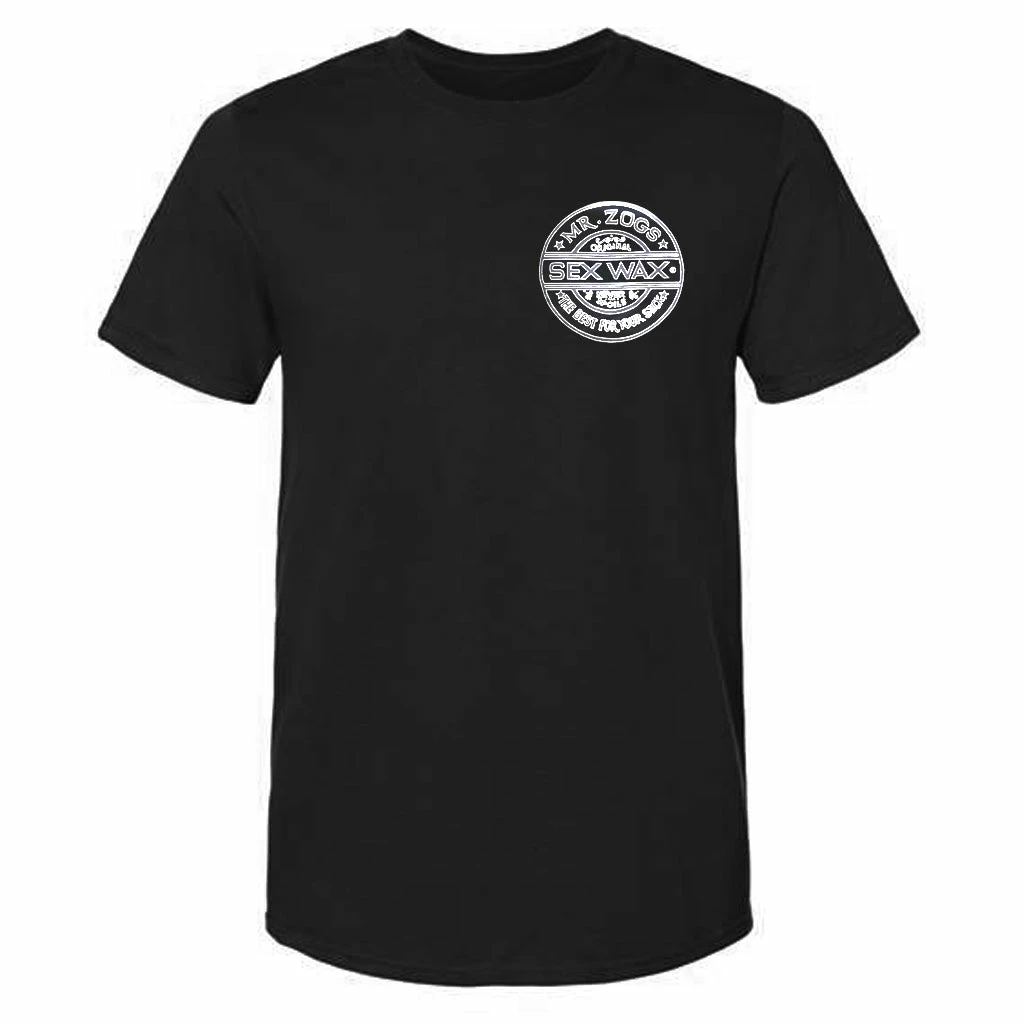 Screen print of the Sex Wax Circular logo with a retro pinstripe line. Small logo front print with large logo on back.
