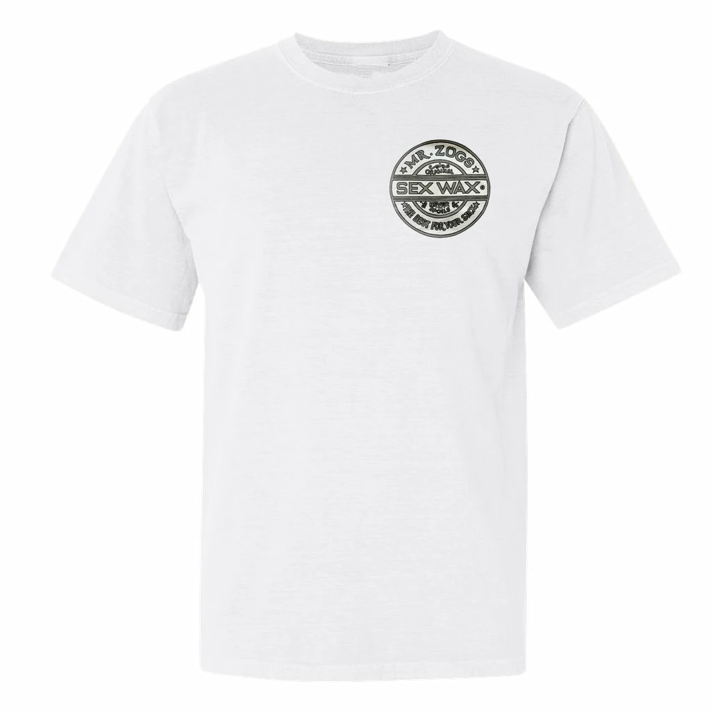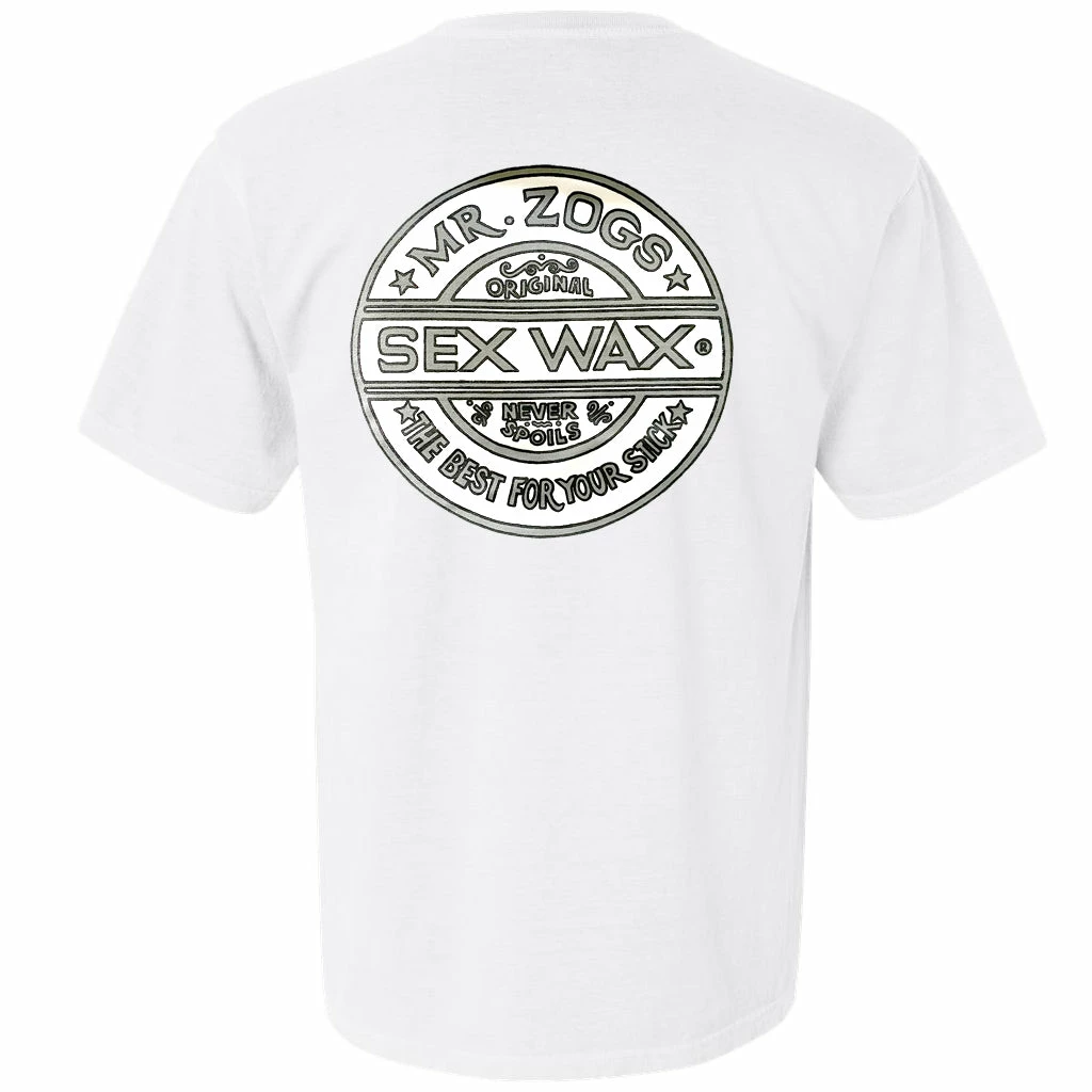Screen print of the Sex Wax Circular logo with a retro pinstripe line. Small logo front print with large logo on back.