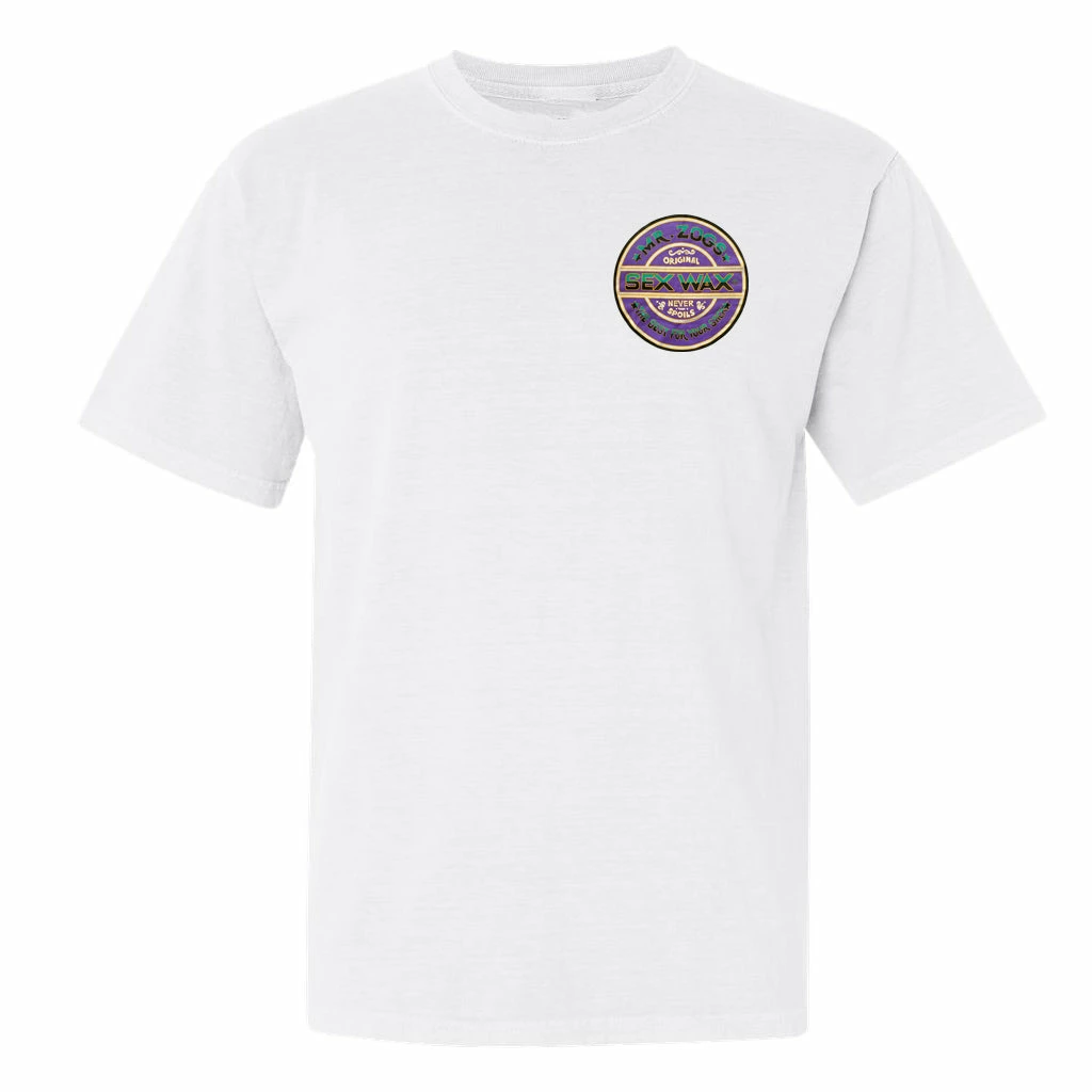 Stylized Sexwax Two Tone Logo back with smaller pocket sized logo front, rendered in blended colors Loose fit 6 oz. White 100% Cotton T-Shirt.